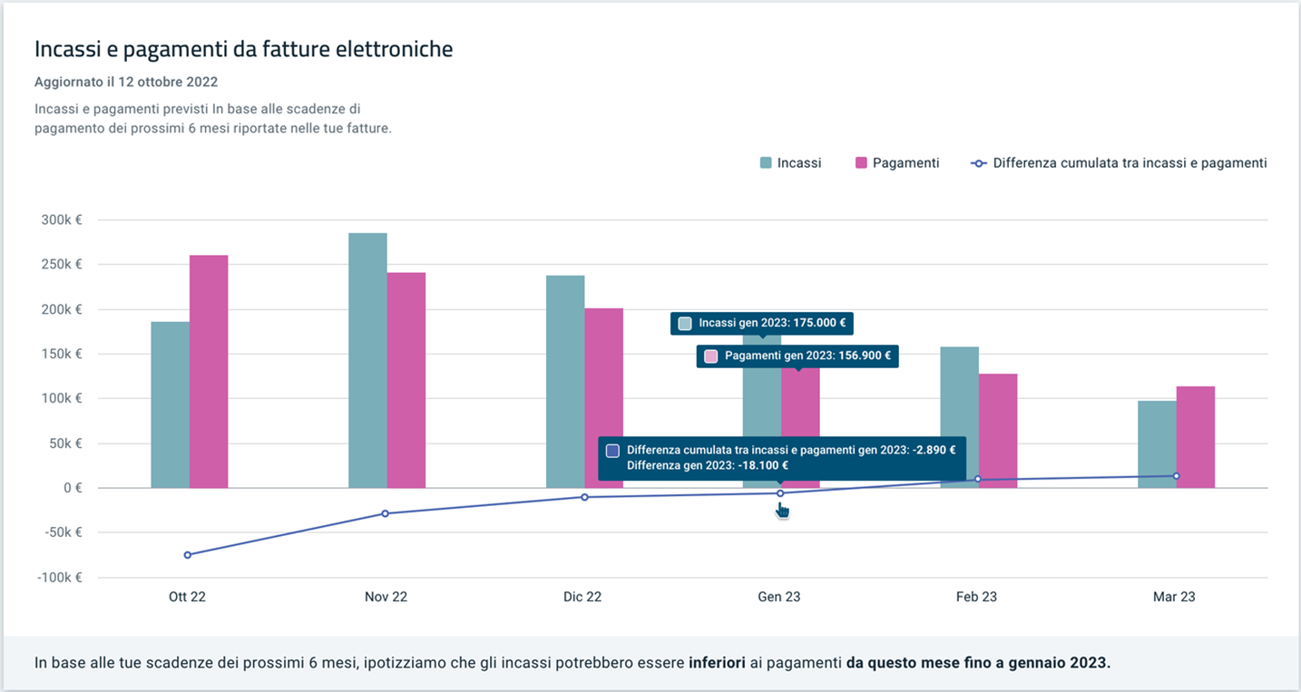 Si tratta di un Insights basato sulle fatture elettroniche del singolo cliente in cui, attraverso la lettura della data scadenza del singolo documento, si calcolano gli incassi e pagamenti previsti nei successivi 6 mesi rispetto alla data di riferimento. Oltre al calcolo degli incassi e pagamenti (raggruppati per mese) viene fornito al cliente la differenza tra incassi e pagamenti a livello mensile ma anche a livello cumulato, suggerendo inoltre l'andamento generale dei successivi 6 mesi attraverso un messaggio testuale sintetico.